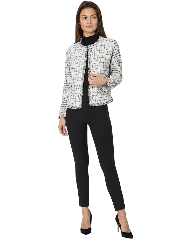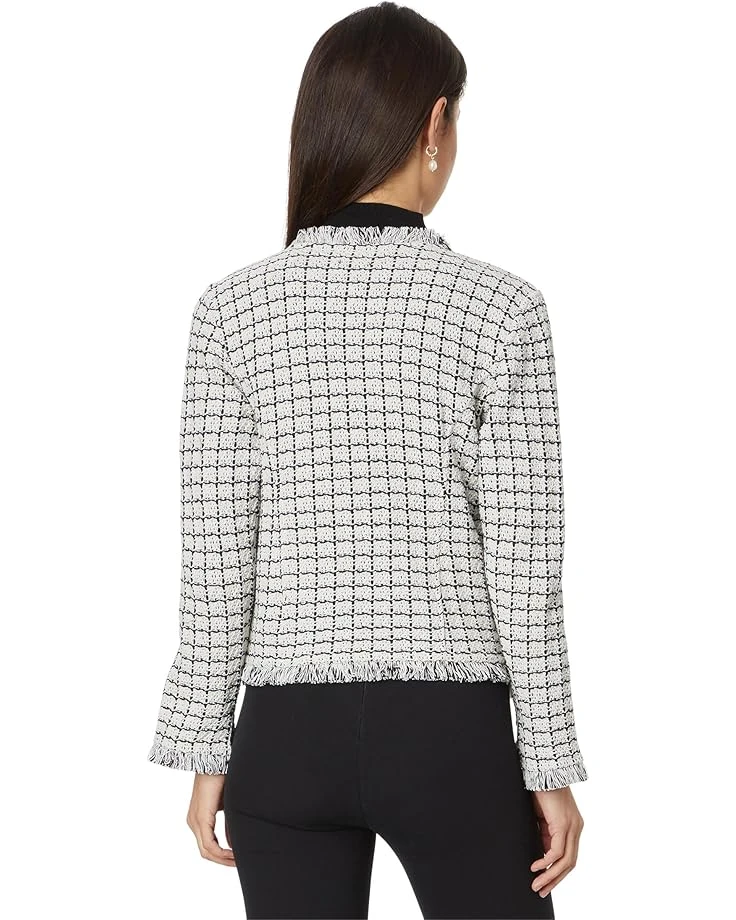 - This NIC+ZOE™ Grid Fringe Mix Knit Pocket Jacket is the perfect blend of style and comfort. Made with a midweight knit fabric, this open front jacket features a round neckline, long sleeves, and fringe detailing on the edges for a touch of sophistication. The allover grid pattern adds a modern twist to this classic piece.