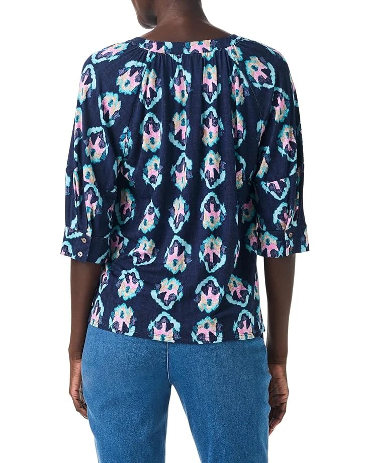 - Express understated glamor with NIC+ZOE™ Ocean Batik Top that shines your style with poppy print. Made from a supremely breathable midweight knit linen-blend fabric for all-day comfort. This relaxed fit pullover top features a split V-neckline, elbow sleeves with buttoned cuffs and drop shoulders. It has a straight hem that sits at the hip.