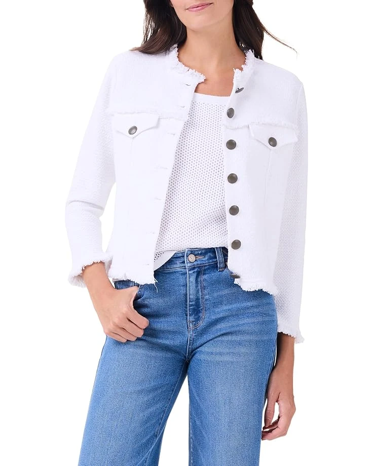 - Make a bold fashion statement wearing the NIC+ZOE™ Petite Utility Fringe Mix Knit Jacket. This smart jacket features a sleek silhouette and a super soft knit construction that offers both style and comfort. With a round neckline, long sleeves, and buttoned front closure, this jacket is perfect for any occasion. The fringe detailing on the neckline and hem adds a touch of flair to this versatile piece.