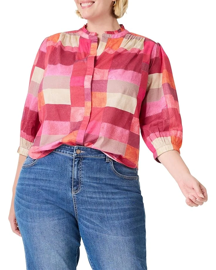 - Refresh your wardrobe choosing the NIC+ZOE™ Plus Sunset Plaid Cotton Girlfriend Shirt! Crafted with a stand collar, three-quarter-length sleeves with elasticized cuffs, and a buttoned front closure, this shirt is perfect for any occasion. The seasonless print, inspired by ocean sunsets, adds a dash of warm-weather flair to your look. It has shirring detail on the collar and back of the shirt.