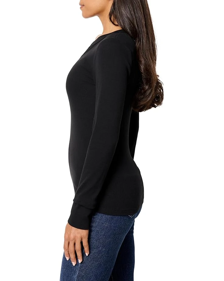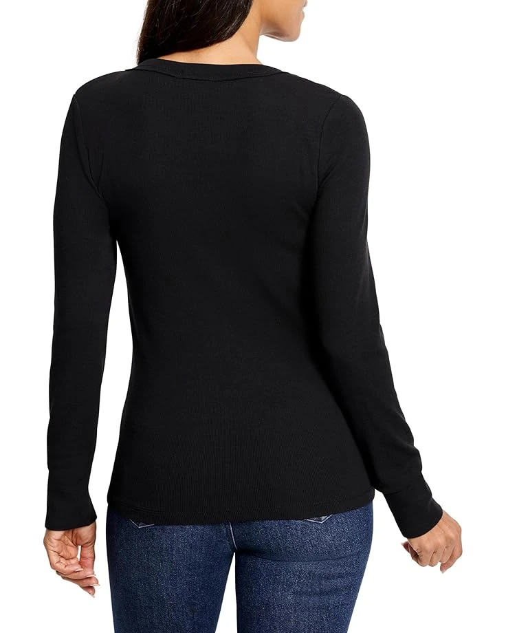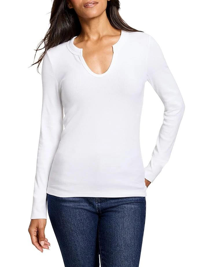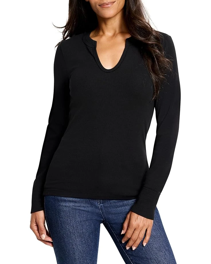 - Slay the casual style statement wearing NIC+ZOE™ Seamed Up Split Neck Rib Tee, that has little things that make all the difference and shows versatility. This midweight long-sleeved tee offers a perfect blend of comfort and style, making it ready for layering or wearing on its own. Designed to have a fitted silhouette, the shape flatters while providing a comfortable, stretchy feel thanks to its ribbed texture. The split neck offers a timeless look, while the raw edge detailing at the customizable cuff elevates. Sitting at the hip with a slight hi-lo hem, this top offers a modern twist on a classic piece;