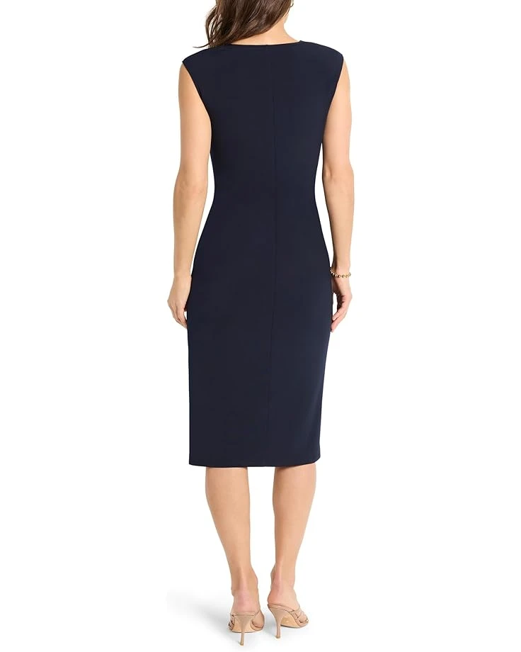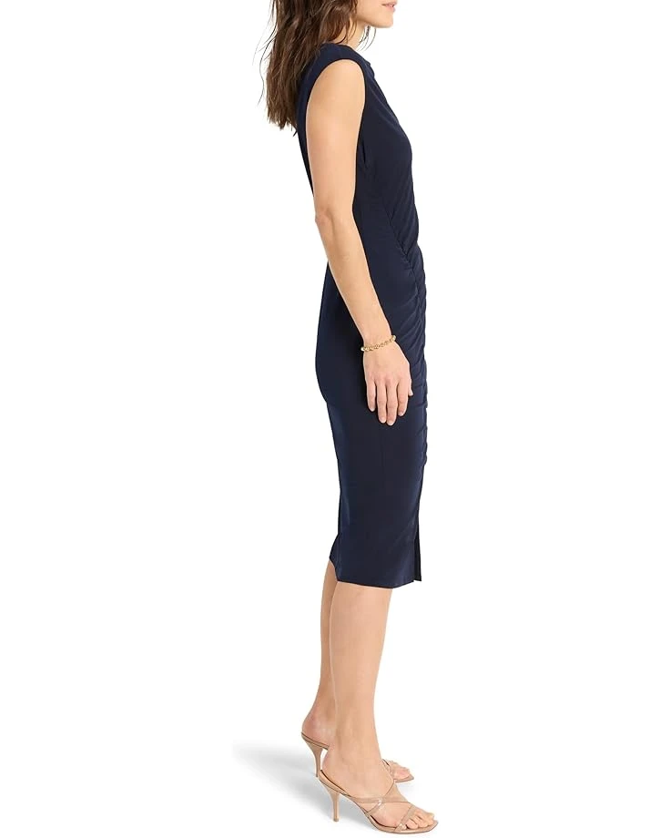 - The NIC+ZOE® Side Ruche Dress exudes style and sophistication. Crafted from high-twist jersey for a smooth, polished look and designed to flatter, this one-and-done look features angled smocking detail and a fitted sheath silhouette with a side-front slit. The bateau neckline and sleeveless design enhance the look, while the high-stretch fabric ensures all-day comfort. Falling below the knee, this pull-on dress is perfect for any special occasion