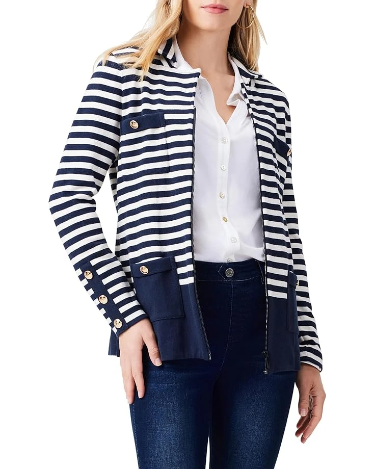 - Update your look by wearing the NIC+ZOE™ Striped City Charm Knit Blazer. The midweight jacket has a shirt collar, long sleeves, knit construction, zip front closure, patch pockets, and a straight hemline. The intricate stripe pattern elevates the overall look effortlessly.