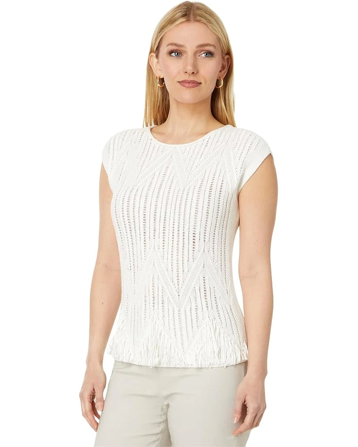 - Chic elegance meets playful charm! The NIC+ZOE™ Textured Swing Sweater boasts a midweight, sleeveless design with a subtle geometric pattern, perfect for layering under a blazer or cardigan. Fringe accents and a keyhole back add stylish flair, making it the ideal versatile piece for any occasion.