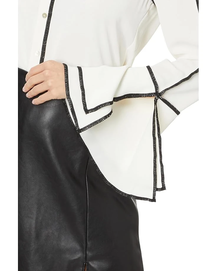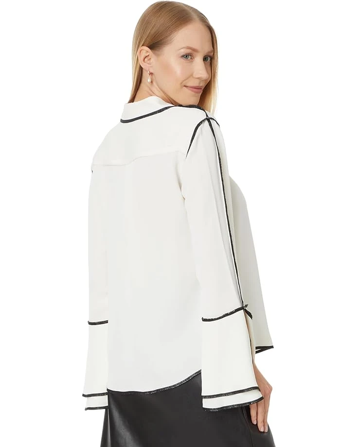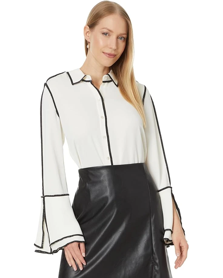 - Flaunt your flair effortlessly styling the NIC+ZOE™ Touch Of Trim Shirt, a woven marvel that embodies elevated fashion. Embrace edgy elegance with its striking black trim along seams, contrastpearl buttons, and flounce long sleeves with slit detail. Enjoy timeless style and comfort with a classic collar and a hip-length hem.